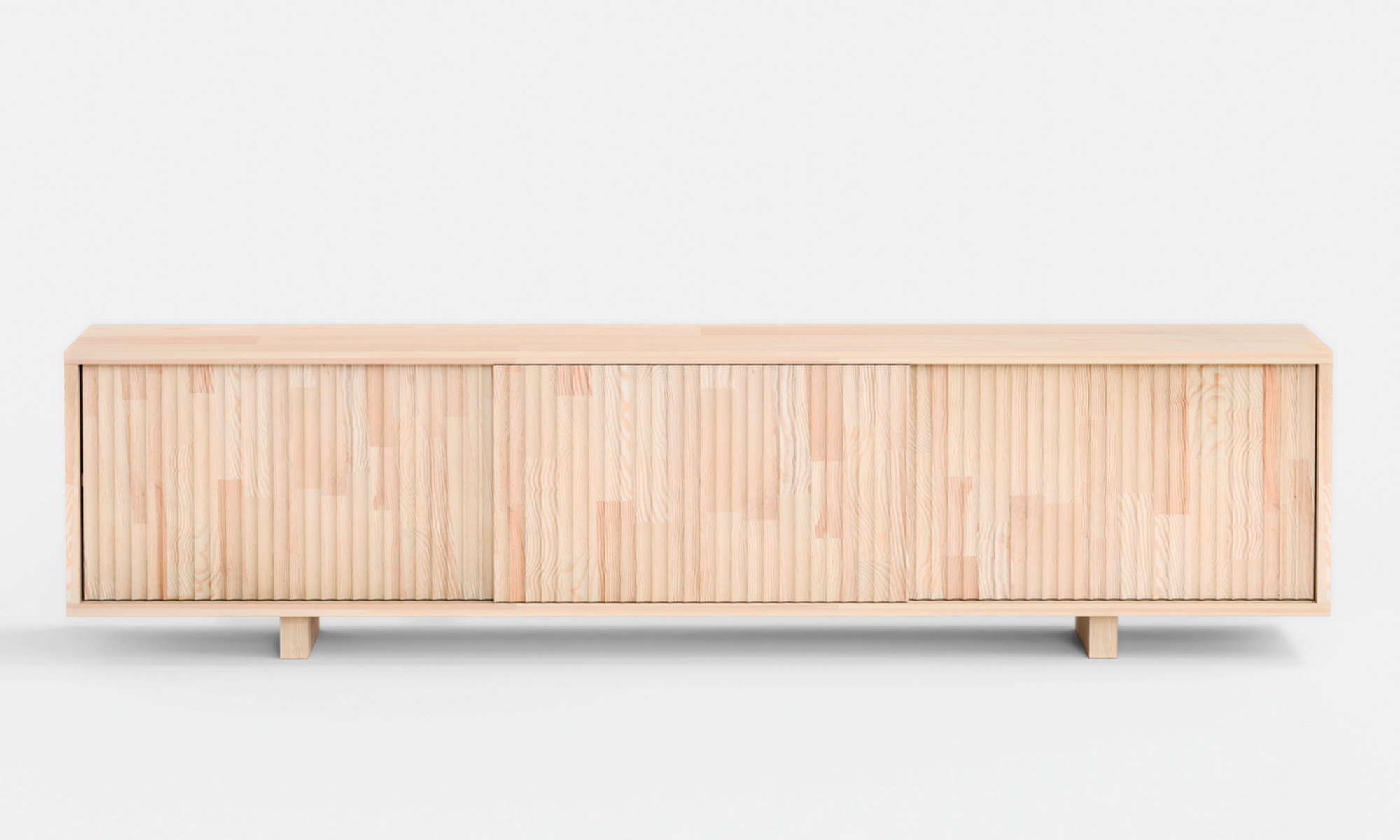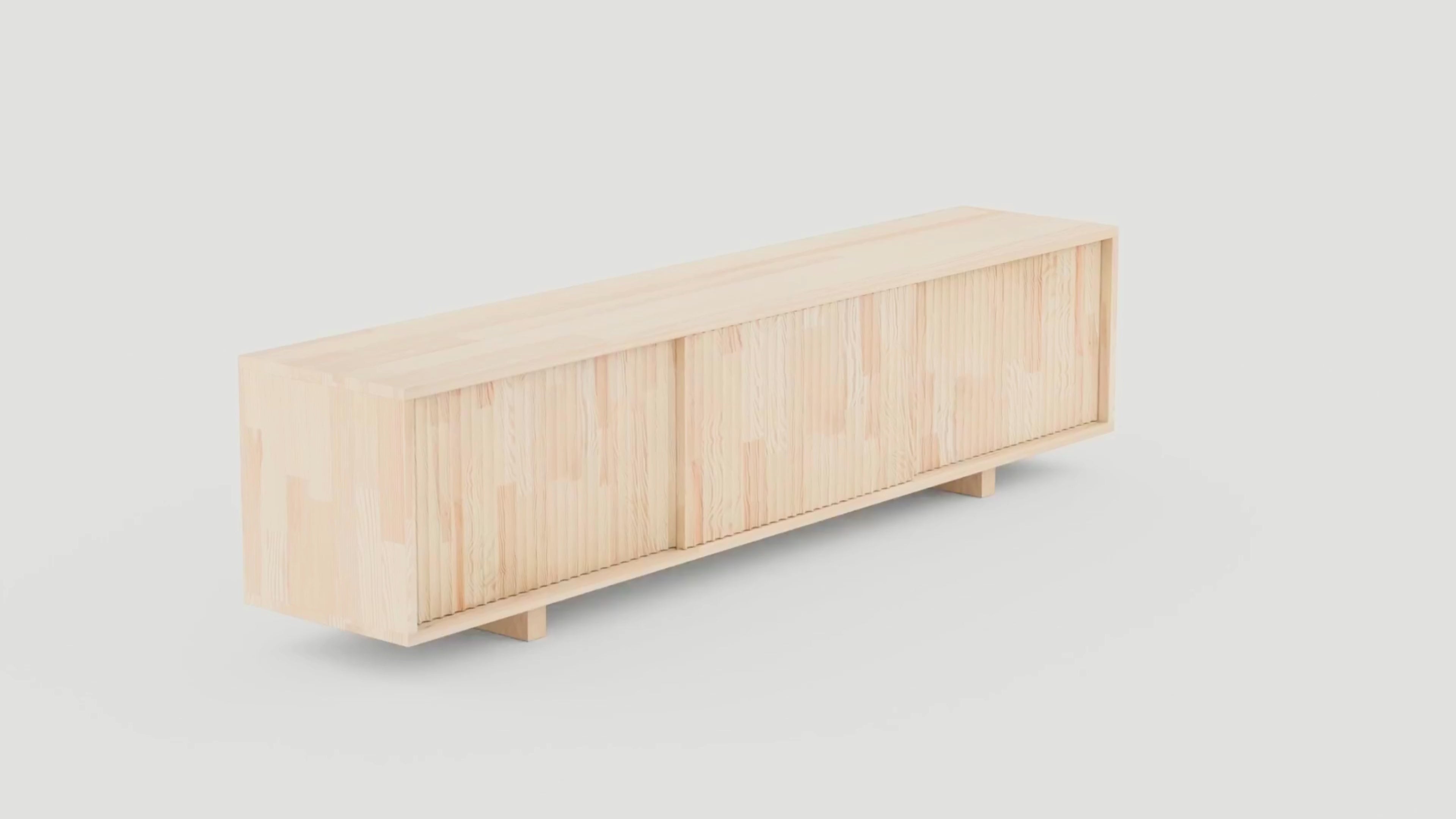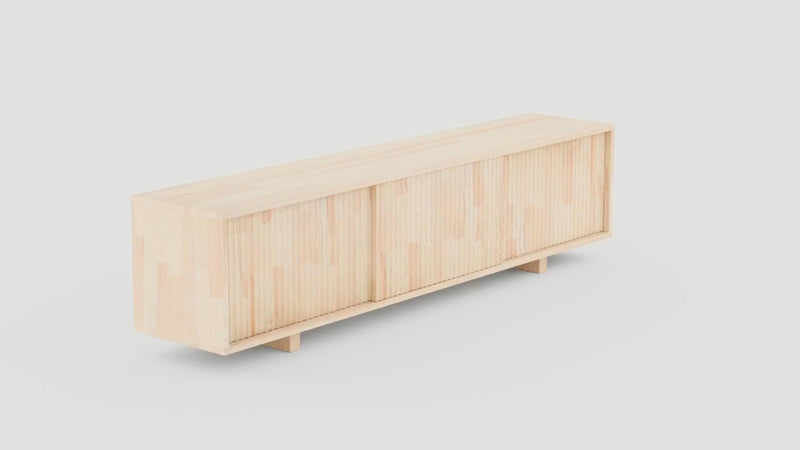 This versatile Scandinavian sideboard is crafted from durable, FSC®-certified pine wood. Its minimalist, textured design features handmade drawers and spacious sliding doors, making it an elegant and eco-friendly storage solution for a living room, dining space, or entryway.